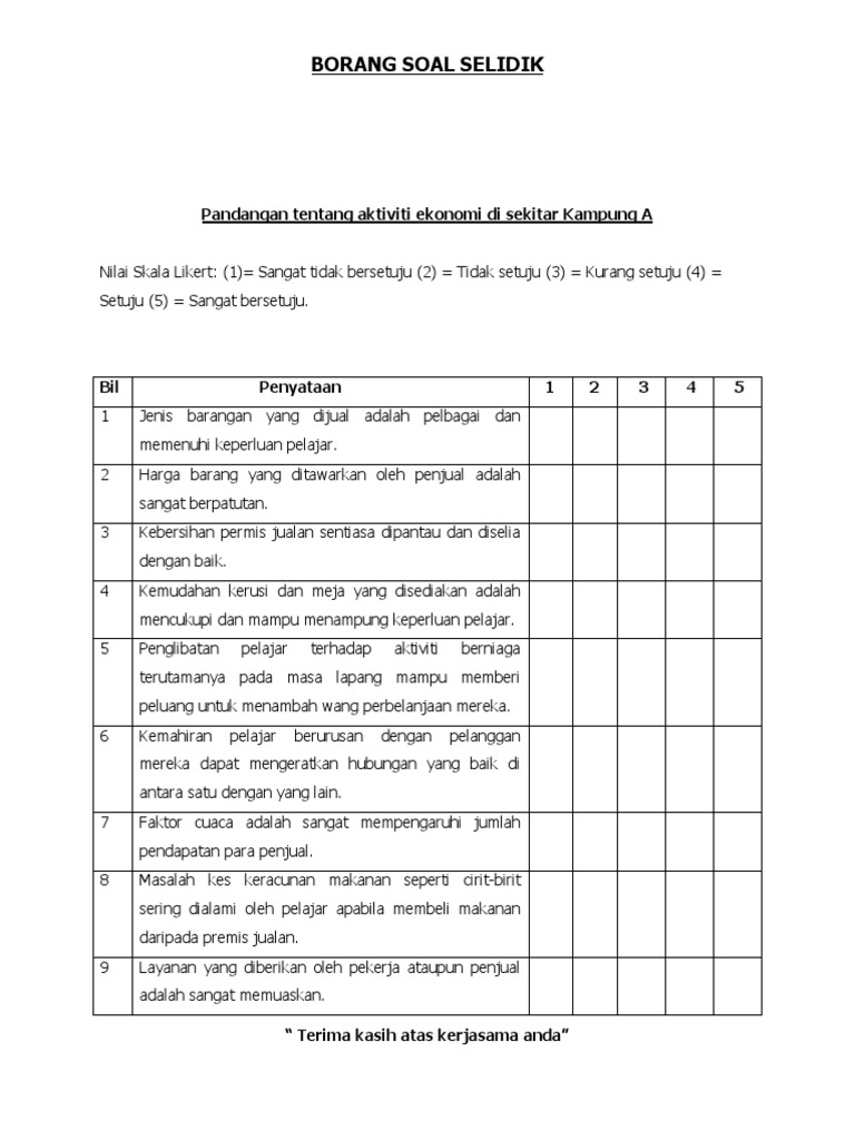 Contoh borang soal selidik pdf. Bagi tujuan kajian ini, satu set soal selidik dengan skala likert empat mata telah digunakan. Objektif kajian ini adalah untuk mengenalpasti jenis jenis produk yang dibeli secara atas talian oleh penduduk taman. Passports, extentions, residency, visa, appointments, citizenship. Konsep dan takrifan sistem pengangkutan.