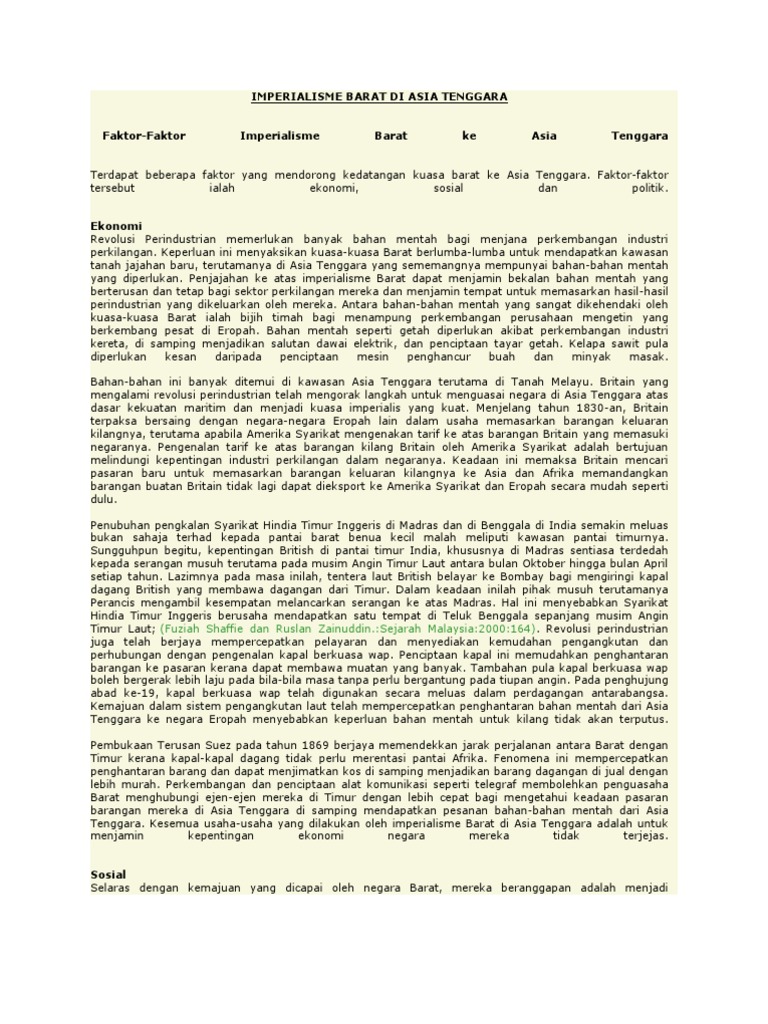 Sejarah from imgv2-2-f.scribdassets.com Terdapat banyak kuasa barat yang. Faktor yang mendorong imperialisme barat di asia tenggara ( keistimewaan asia tenggara ). Dalam pemenuhan ambisi imperialismenya, barat memanfaatkan arab saudi dan ideologi wahabisme. Sedangkan di asia timur dikuasai oleh cina dan jepang. Jelaskan secara rinci dong, semisal kolonialisme di korea dan imperialisme cina jepang. Kebutuhan akan bahan baku bagi industri jepang. Sejarah tingkatan4 kssm bab6 ancaman komunis. Pentadbiran kerajaan penjajah mengamalkan diskriminasi dan penindasan.