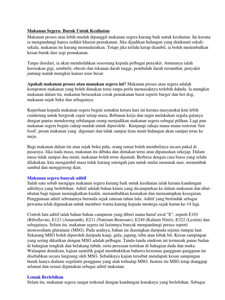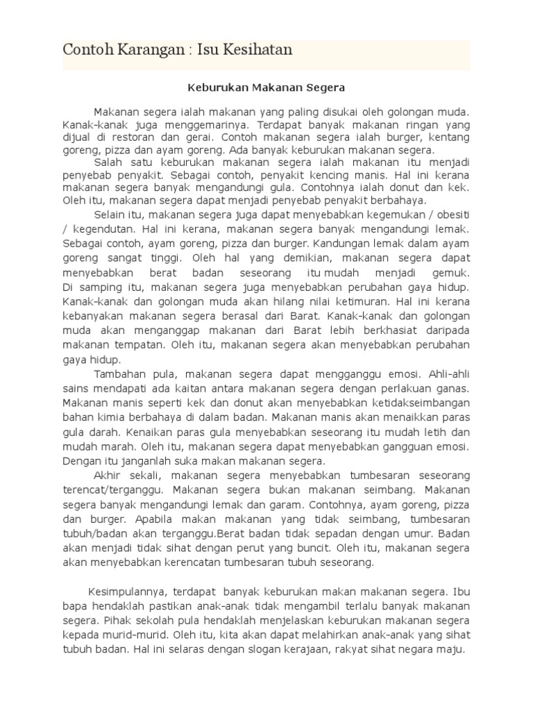 hal ini berlaku kesimpulan amalan makan di restoran makanan segera sebenarnya tidaklah salah. Informasi tentang contoh karangan, karangan adalah sebuah karya tulis yang berbentuk prosa naratif fiktif. Syarahan membicarakan hal yang 3. Nur 'izzati bt ahmad disediakan untuk : Dan yang terakhir konsumsilah makanan sehat serta bergizi agar tubuh. Oleh hal yang demikian, makanan segera dapat menyebabkan berat badan seseorang itu mudah menjadi gemuk.di samping itu, makanan. Karangan adalah bentuk tulisan yang mengungkapkan pikiran dan perasaan pengarang dalam satu kesatuan tema yang utuh. Sebagai contoh, ayam goreng, pizza dan burger. Kandungan pada tempe 2.1 protein 2.2 vitamin k 3 contoh pengembangan kerangka karangan. Kandungan lemak dalam ayam goreng sangat tinggi. Makanan segera kian digemari oleh masyarakat kini dan merupakan gaya hidup kebanyakan orang. Kenapa ramai masuk wad kecemasan? Anak adam, pakailah perhaisanmu ketika setiap kali sembahyang.