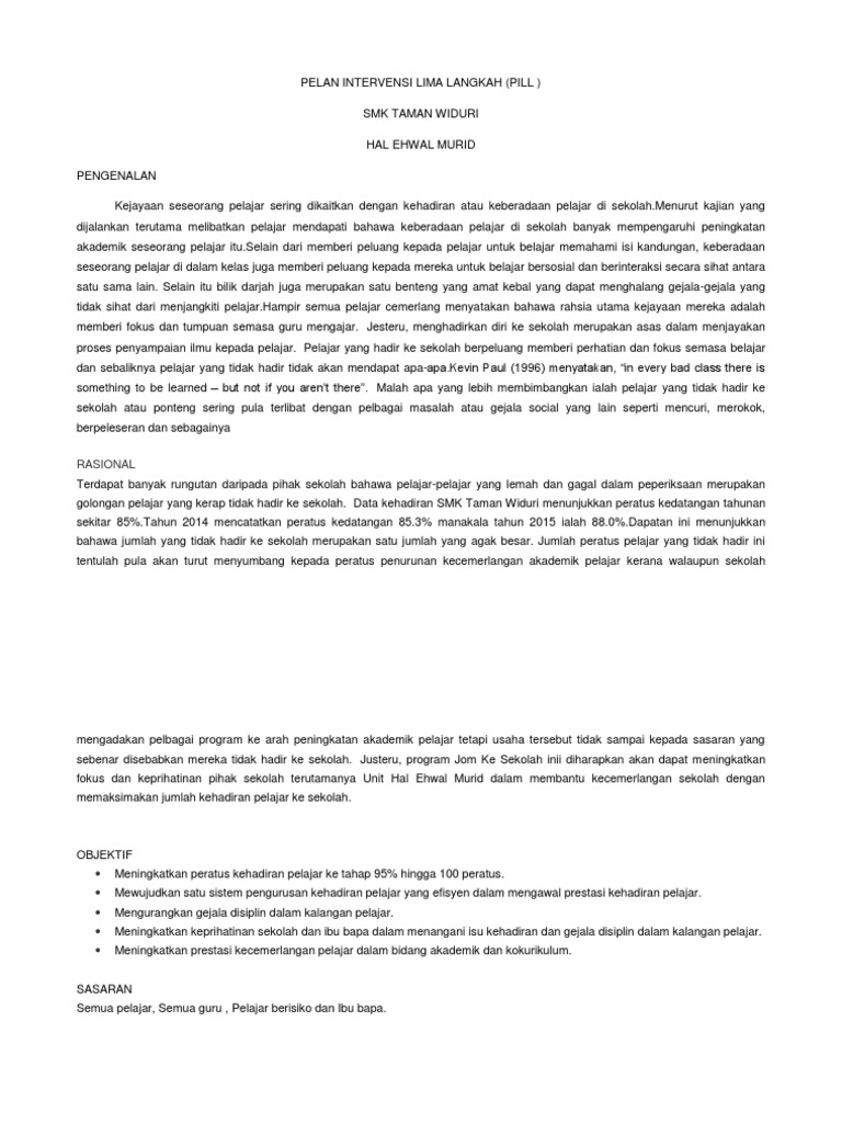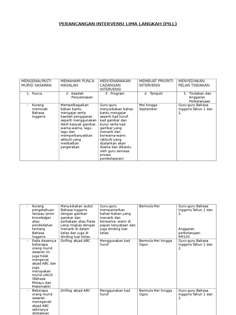 Identify target groups.1.1 pupils could not master english language. 203045769 program intervensi lima langkah bahasa melayu penulisan doc.doc. Pelan pembangunan pendidikan malaysia klik di sini 2. Program intervensi lima langkah (pill). Contoh pelan intervensi lima langkah (pill).