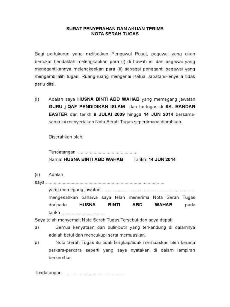 Surat serahan tugas nota serah tugas guru guru paud. Contoh surat tugas bendahara bos sd. Hal ini termasuklah pertukaran, persaraan atau penamatan perkhidmatan. Contoh surat kuasa pengalihan tugas. Bagi yang masih kekal di stesen lama, teruskan usaha & bakti anda. Contoh surat permohonan pergantian spesimen bendahara bos. Terimakasih telah membaca artikel contoh surat serah terima pekerjaan untuk guru. Contoh nota serah tugas guru. Semoga contoh surat serah terima pekerjaan untuk guru ini dapat bermanfaat bagi anda yang membutuhkannya. Nota serah tugas ini seterusnya diserahkan kepada pegawai yang mengambilalih jawatan tersebut dan pegawai berkenaan hendaklah menandatangani surat akuan terima nota serah tugas. Penerangan am nota serah tugas 1. Kedudukan kewangan akaun dan lain lain. Kedudukan terakhir tugas tugas yang belum selesai.