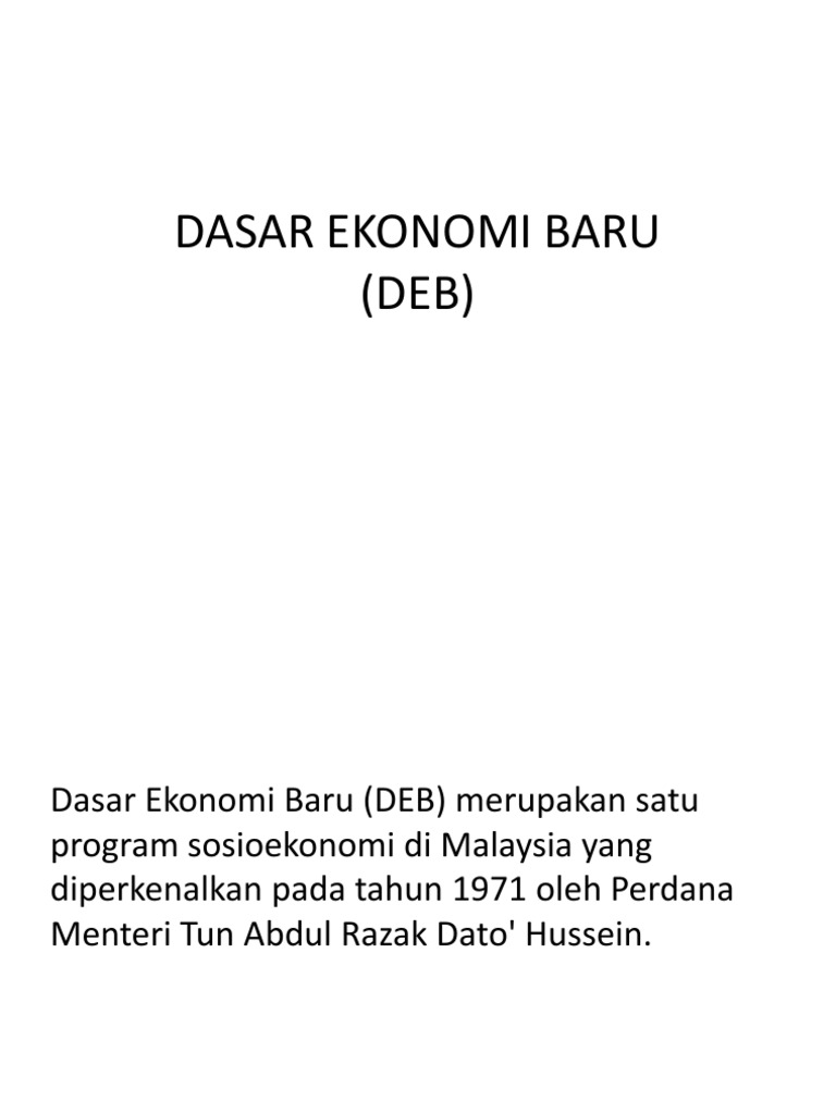 Diperkenalkan pada tahun 1971 oleh perdana menteri tun abdul razak dato' hussein. Tujuan ekonomi islam terdapat 2 kelompok besar dalam ekonomi konvensional, yaitu kapitalis dan sosialis. Bagi singkatan dasar ekonomi baru iaitu deb. Peristiwa 13 mei 1969 merupakan satu peristiwa hitam dalam sejarah negara kita kerana ia melibatkan pertelingkahan dan rusuhan antara kaum. Bab 2 dasar ekonomi baru 2.1 pengenalan 2.2 sosioekonomi malaysia sebelum deb.
